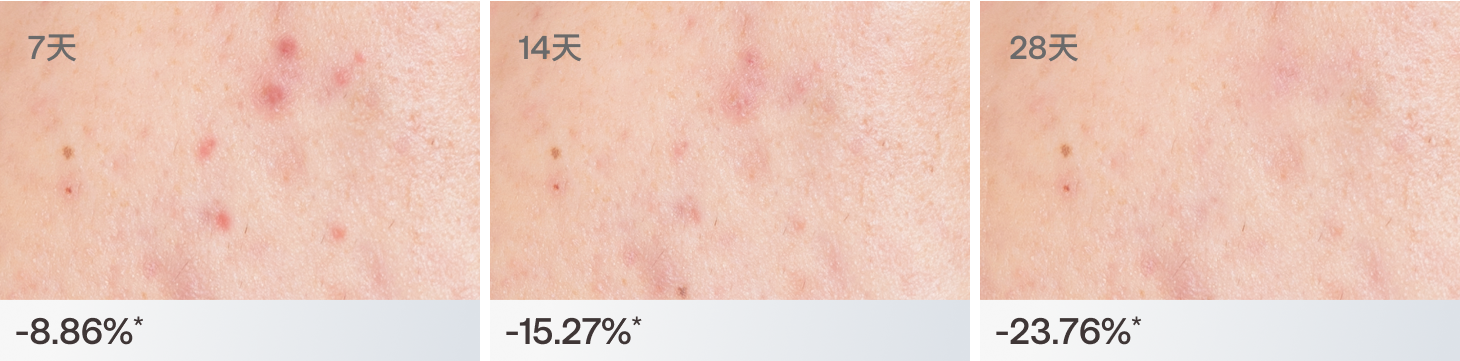 *指產品使用7天、14天、28天,對淡化斑印、淡化痘印、提升肌膚光澤、提升肌膚彈性、減弱泛紅都有一定改善。